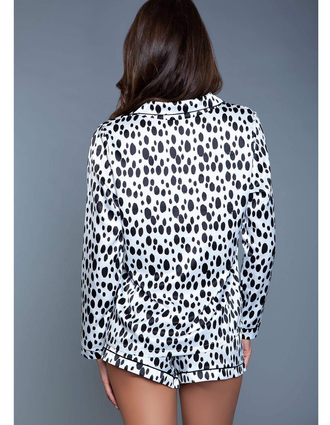 Get ready for sweet dreams in this 2pc Dalmatian pajama set. Its satin-smooth fabric will keep her comfortable while the striking Dalmatian print, revere collar, and button placket make for statement style. The matching shorts come with a stretch waistband for a great fit!
