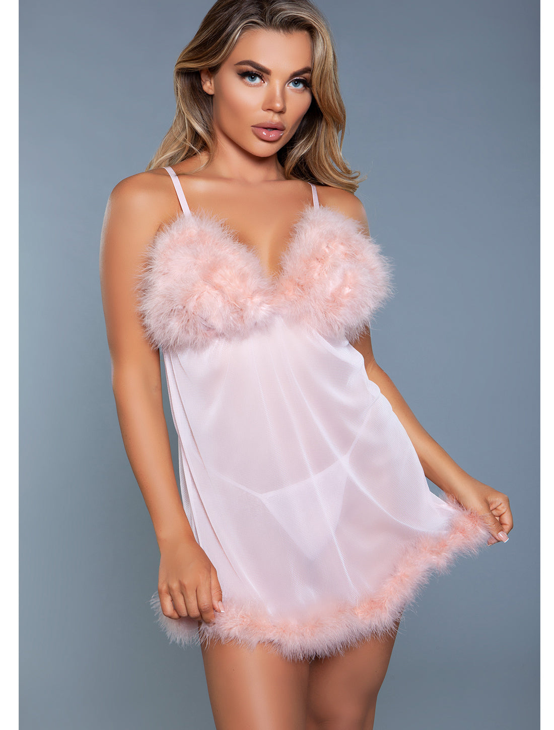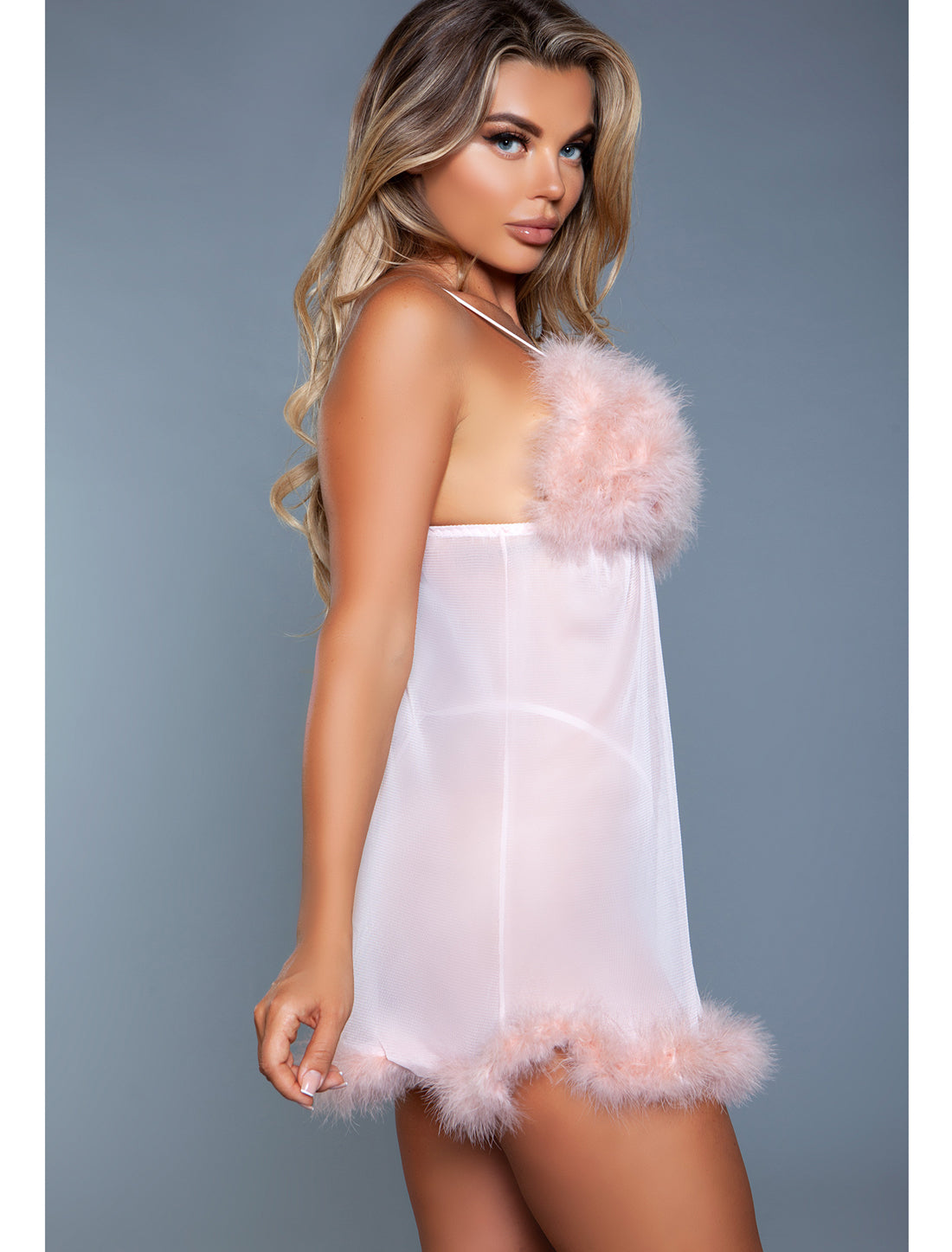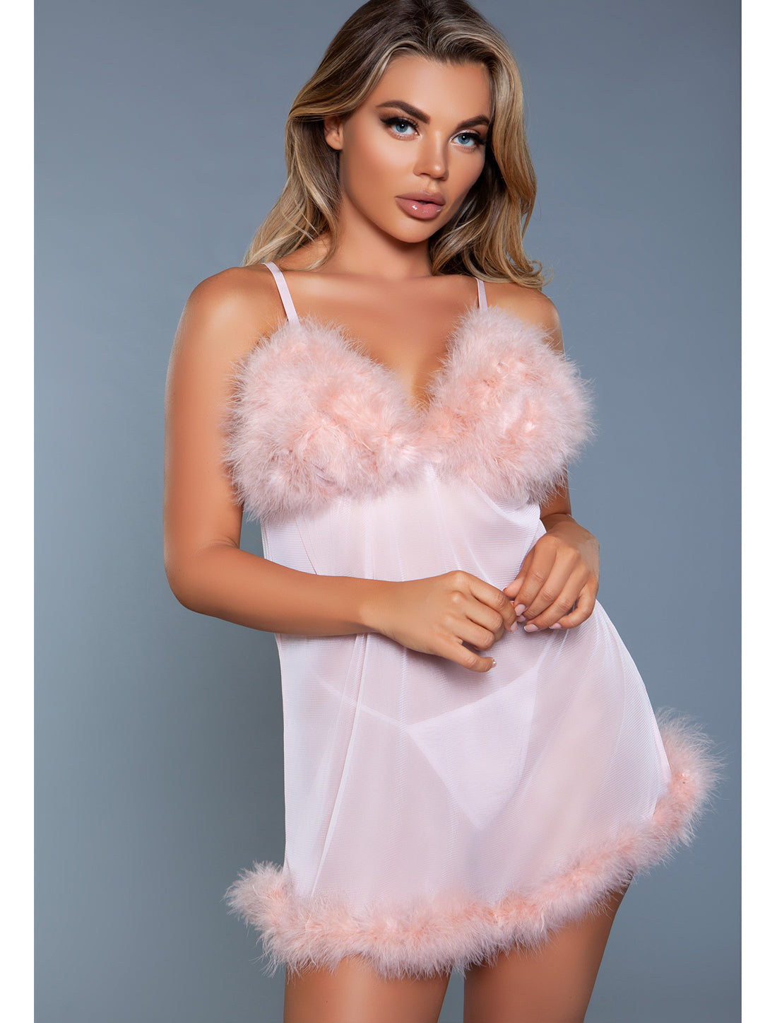 Add some playful seduction to her lingerie wardrobe! This ultra-flirty nightie oozes luxury with its faux fur cups and faux fur hem. This unique candy pink piece is perfect for a playful night. Has a sheer, flowing, mesh skirt. Time to take a risk and unleash her sultry side!